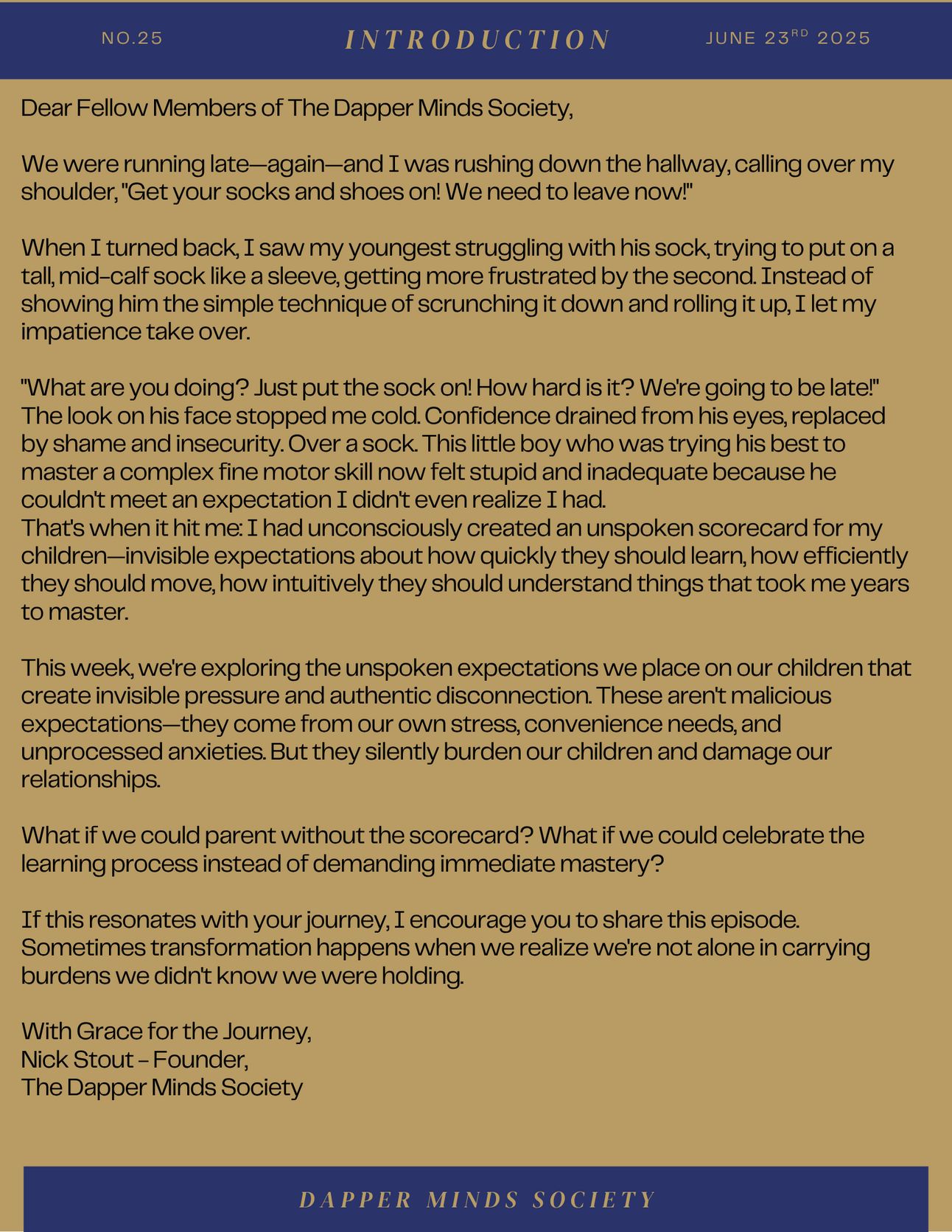 Every parent carries an invisible scorecard for their children. We measure their behavior against our standards, their achievements against our hopes, their personalities against our preferences. These scorecards aren't inherently evil—they often come from genuine love and concern for our children's futures. But they become destructive when they're unspoken, unexamined, and unrealistic.